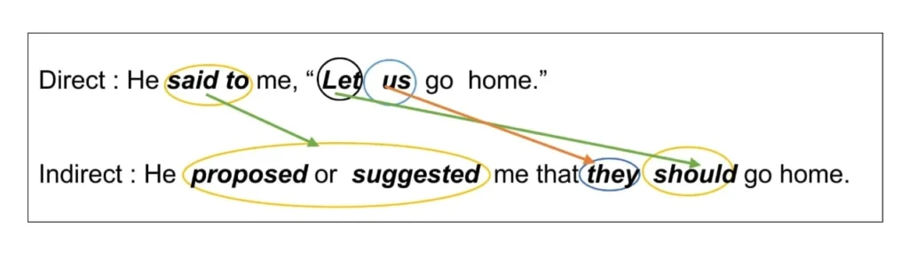 When “Let” in the Direct Speech expresses a Proposal or Suggestion, we may use “Should” or “Let” and change the Reporting Verb into proposing or suggesting. [ It indicates Proposal or Suggestion]